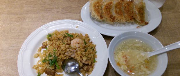 川口キャスティ1階のエスカレーター降り口すぐの好立地に、餃子屋(?)がオープンしていた。以前は焼肉屋か何かだった場所だ(未訪問)。その居ぬきのためか内装はゆったりめで広々としている。オープンしたての夕飯時ということもあってか、店は大変混雑。1人で入店したのでカウンターに即着席できたが、団体客は待ちの列ができていた。メニューは餃子が数種類に中華系の麺、飯、一品もの、それにアルコールといったラインナップ。それとは別にディナーセットなるものがあったので、その中からチャーハンのセットを注文した。供されたのは写真の通りのもの。漬物類がない定食は珍しい。自分は漬物を好まないので構わないが、一般的にはどうだろうか。ザーサイの一つもつくべきかもしれない。味は好みに合っていた。餃子はニンニク強めに感じたので注意。また、混雑のせいだとは思うが、チャーハンと餃子の提供時間が大きくずれていて、普通に食べたらチャーハンがなくなる頃に餃子が来た(写真のためにゆっくりチャーハンを食べた。写真が食いかけなのはそういう事情)。オペレーションの改善を望む。